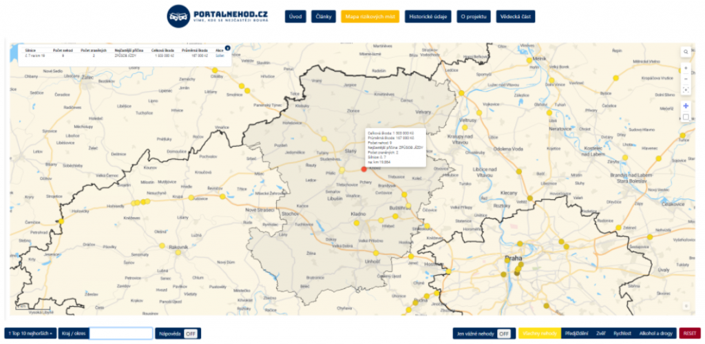 - zobrazit detailní informace o jednotlivých místech, včetně počtu nehod, celkové a průměrné výše škody, nejčastější příčiny nehody, počtu zraněných osob.